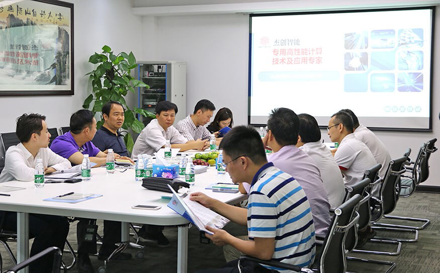 研发中心总经理朱勇杰向各位领导介绍了公司自主研发的系列产品和技术,重点讲解了专用高性能计算平台这一核心技术的研发历程、行业地位、应用领域、发展前景等,以及依托该平台研发出的一系列具有一流水平的密码分析和口令分析产品、无人机侦察管控一体化设备视频图像模式识别服务器、区块链工作量证明服务器等。
